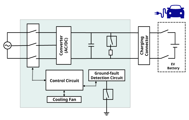 继电器用于断开电源,以确保在EV充电过程中检测到异常时的安全性。
