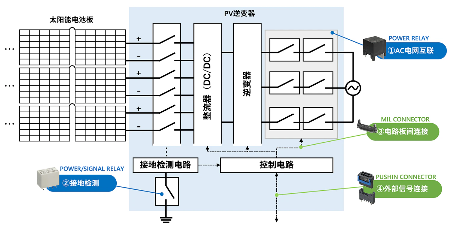 介绍推荐太阳能发电专用应用程序使用的欧姆龙电子元件(继电器、开关、连接器、传感器)。