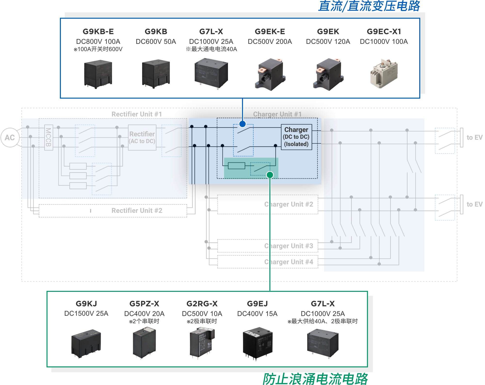 直流快速充电桩Mode 4被安装在高速公路服务区等要求短时间内充电的场所。介绍一款可满足该直流快速充电桩要求的高功率输出、低损耗(发热)及异常检测功能(辅助触点)的欧姆龙继电器。