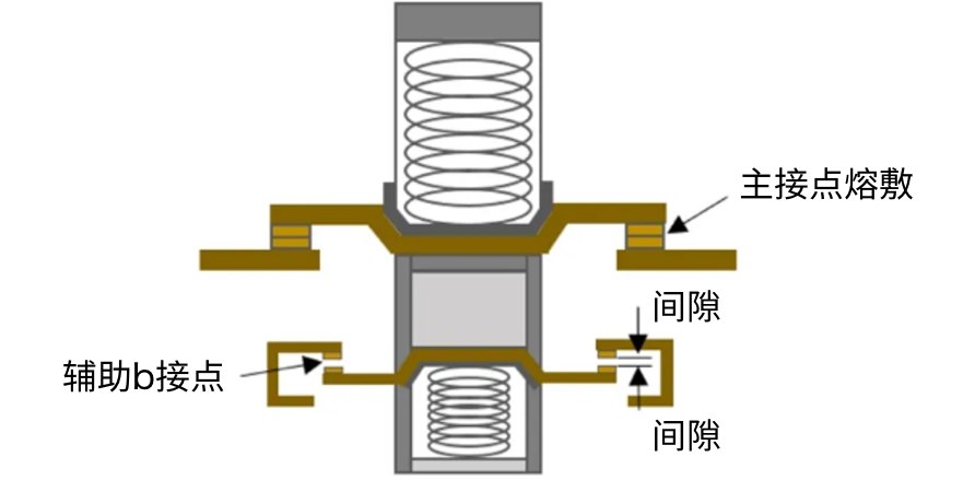 *在继电器主体与辅助接点区块相互组合、继电器主体的a接点(主接点)发生熔敷时,即使解除了线圈的励磁,辅助接点区块的所有b接点均可满足2.5kV以上耐冲击电压的条件、或具有确保0.5mm以上接点间隔的结构