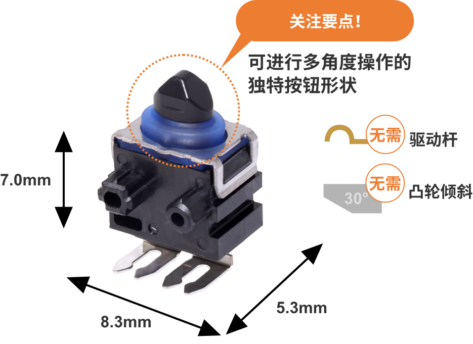 实现(1)和(2)最简单的方法就是从正上方按压,也就是从行程(完全按下开关的距离)最短的角度按压。但要设计行程只有几毫米的超微小型开关的垂直按压并不容易。